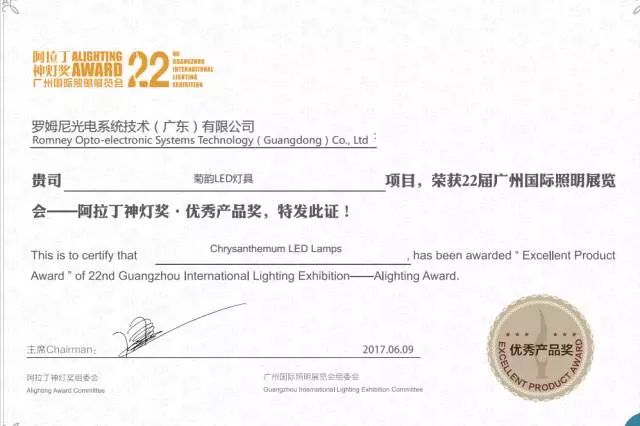 近期,由廣州國際照明展覽會舉辦的阿拉丁神燈獎隆重展開,ROMNEY羅姆尼產品“菊韻”系列LED燈具從數千件產品脫穎而出,奪得優秀產品獎。入圍評選“十大優秀產品”的環節。