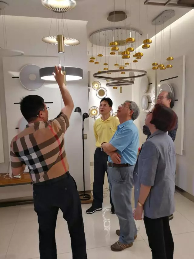 5月5日,阿拉丁神燈獎終審評委臺灣科技大學蕭弘清教授、南京工業大學王海波教授、鄭亞琴秘書長等一行蒞臨ROMNEY羅姆尼,參觀考察公司及入圍復審產品“菊韻”系列LED燈具。