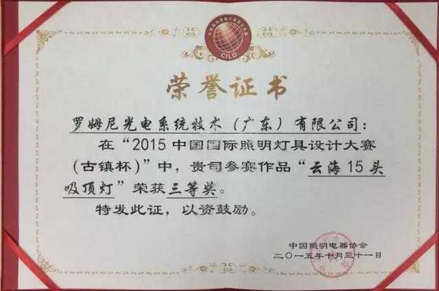 2015中國國際照明燈具設計大賽云海系列三等獎獎狀