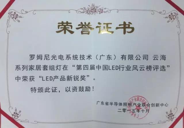 2015年10月榮獲廣東省半導體照明產業聯合創新中心的“第四屆中國LED行業風云榜評選”中榮獲“LED產品新銳獎”。