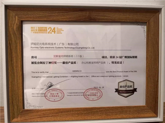 喜報連連!ROMNEY羅姆尼的專利產品“漢斯室內照明系統(2.0版)”憑借靈活多變、功能強大的設計,榮獲24屆廣州照明展覽會阿拉丁神燈獎——最佳產品獎(辦公和教室照明展覽類)!