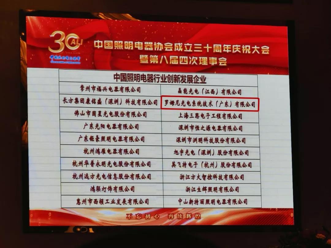 大會總結了我國照明電器行業三十年來取得的成就,展現了改革開放以來我國照明電器行業的發展風貌,對181家行業優秀集體和92名行業先進個人進行了表彰。其中ROMNEY羅姆尼榮獲“中國照明電器行業創新發展企業”稱號。