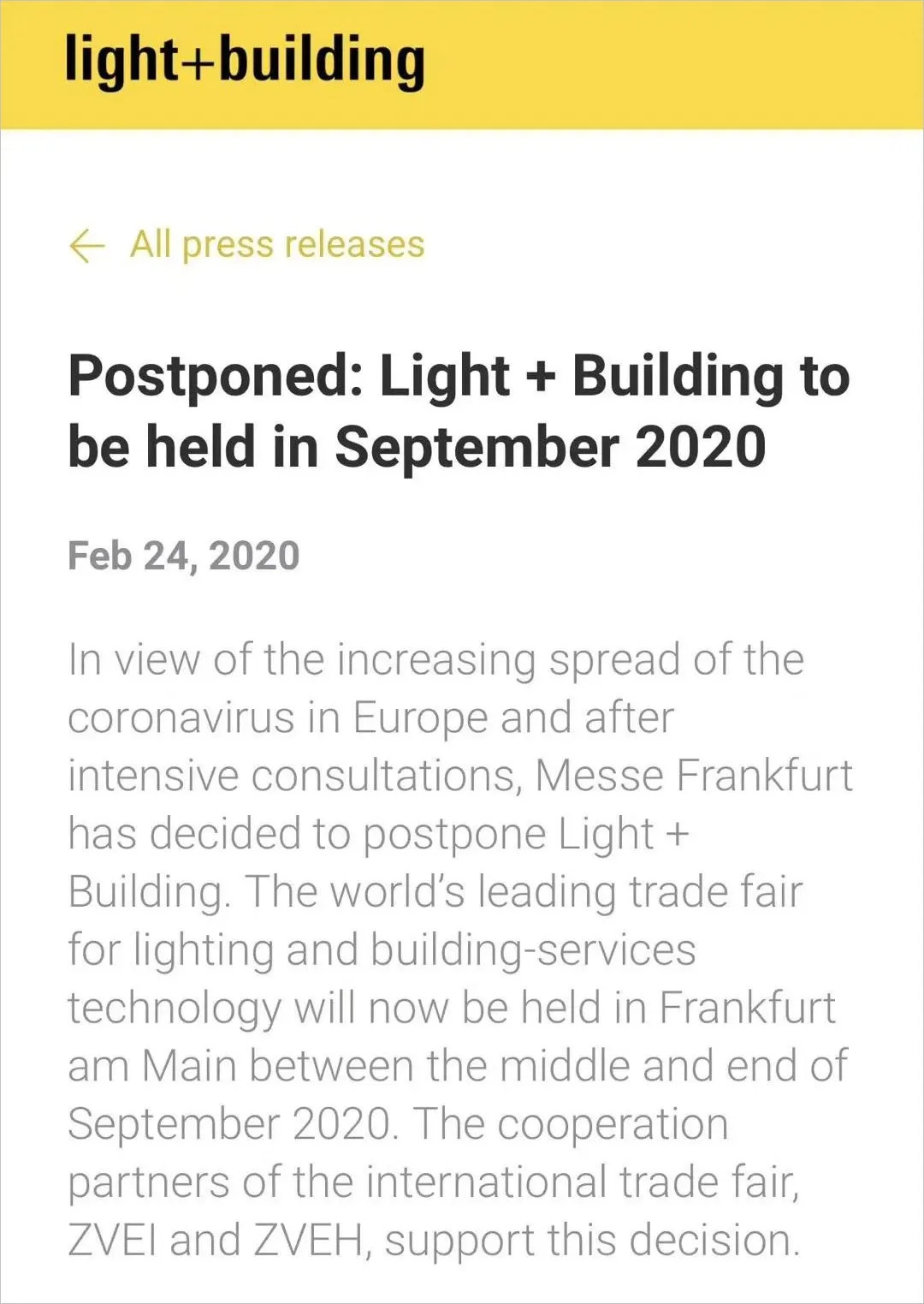 據法蘭克福照明建筑展官網最新消息顯示:“鑒于冠狀病毒在歐洲的傳播越來越多,經過密集磋商,法蘭克福展覽決定推遲本屆照明+建筑展的舉辦。世界領先的照明和建筑服務技術交易會將于2020年9月中旬至下旬在法蘭克福舉行。“國際貿易博覽會的合作伙伴ZVEI and ZVEH支持這一決定。