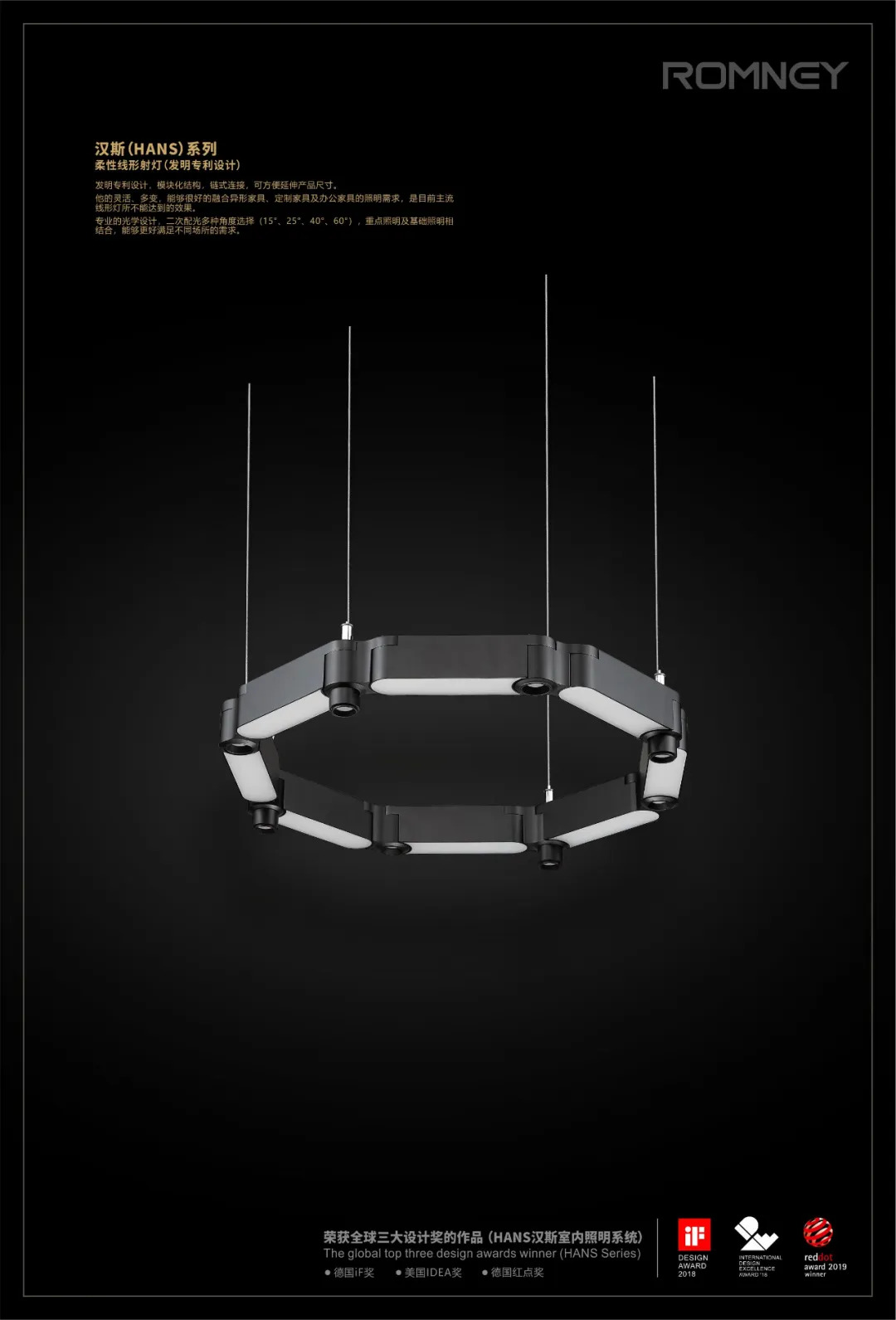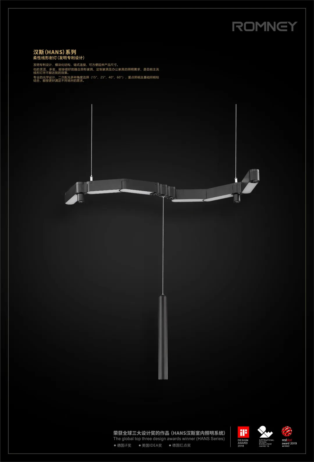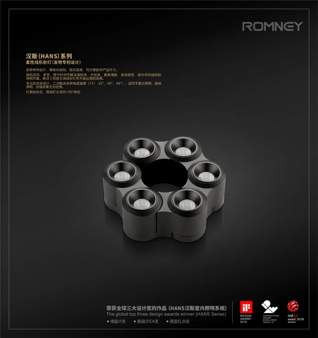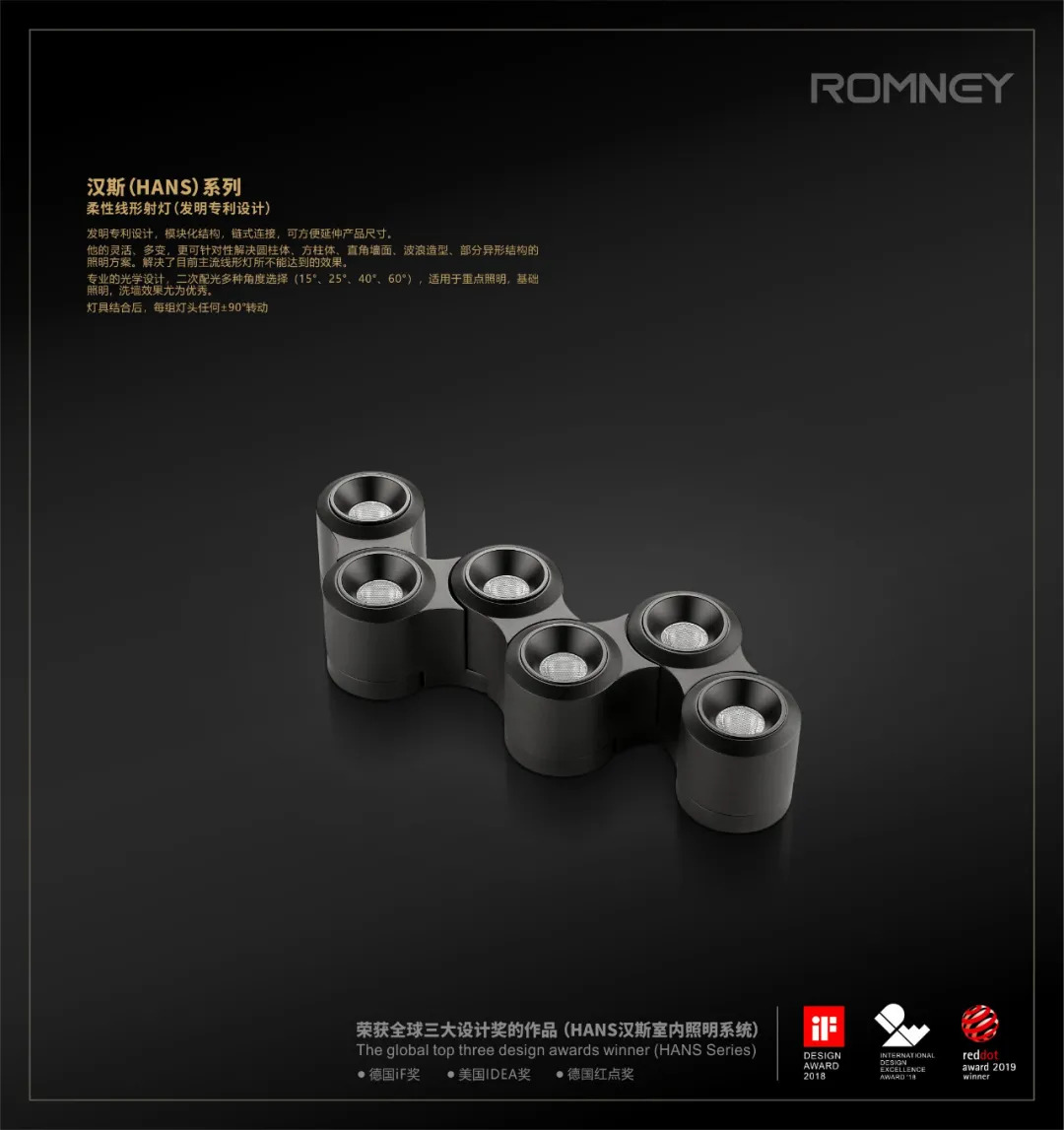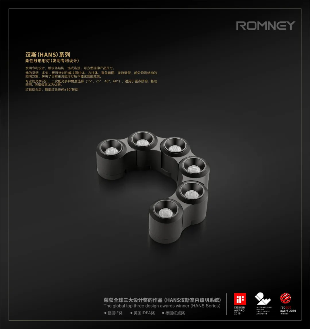 ROMNEY漢斯(HANS)系列是中國照明行業唯一拿最齊全球三大設計獎的作品,從2018年(HANS)漢斯系列榮獲 “德國IF獎”、“美國IDEA獎”、2019年榮獲 “德國紅點獎”全球三大設計獎作品,漢斯系列是一款具有革命性意義的LED照明燈具新產品,羅姆尼不僅展現了中國設計的不俗實力,也代表中國燈具設計已登上國際產品設計界主流舞臺。