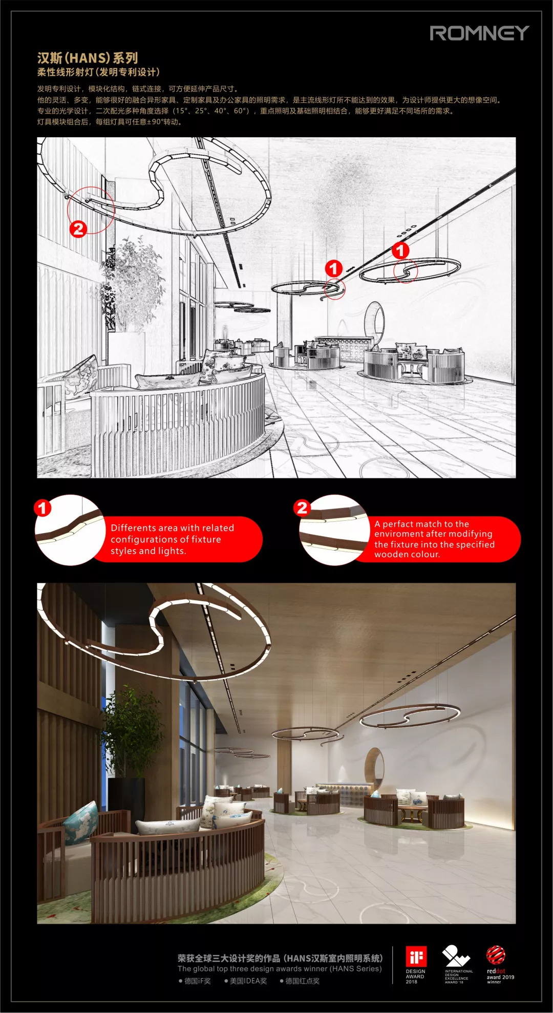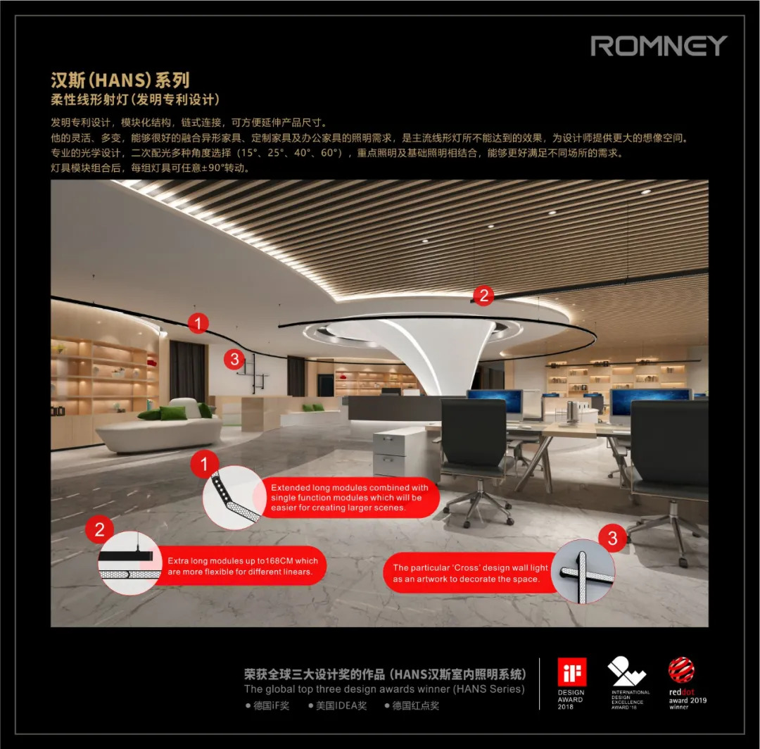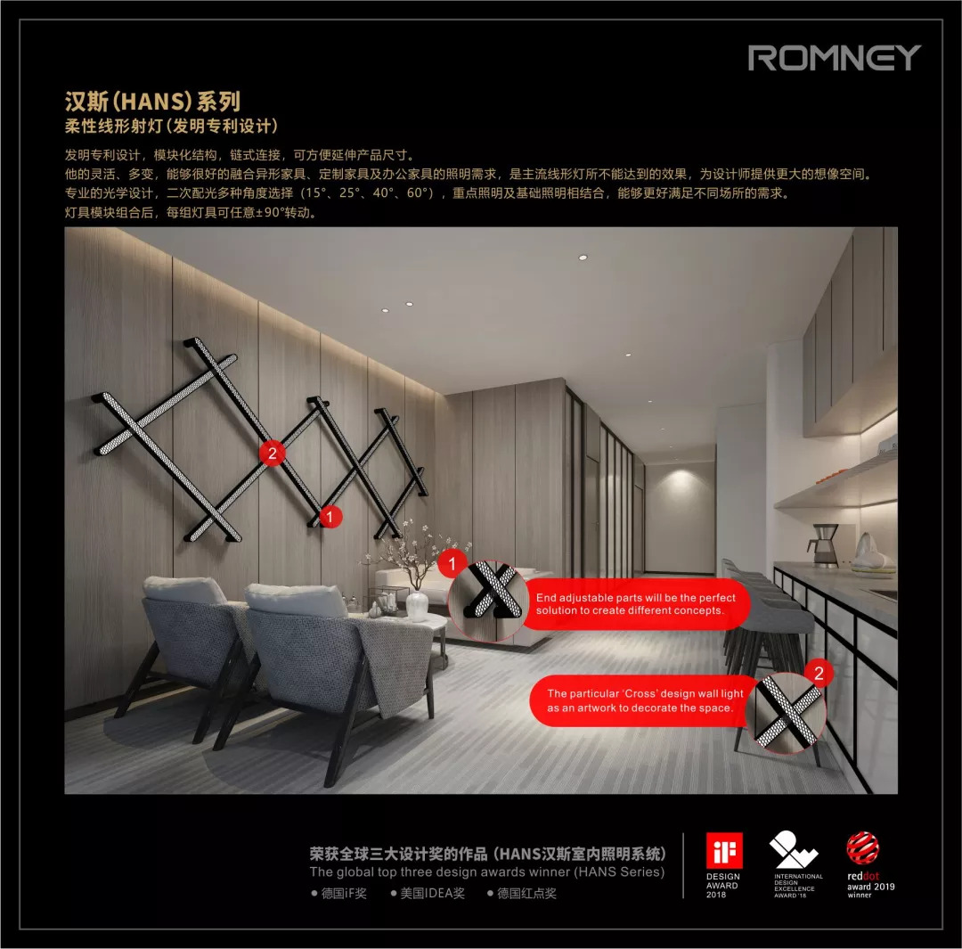 ROMNEY漢斯(HANS)室內照明燈具系統,是目前中國照明行業唯一拿齊全球三大設計獎的作品(德國紅點獎、德國iF獎、美國IDEA獎)!