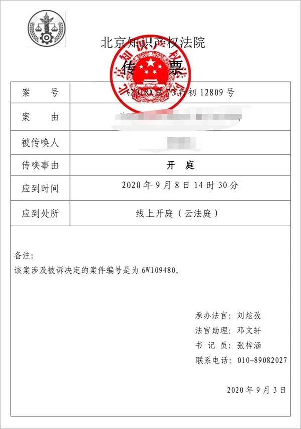 ▲ 北京知識產權法院開庭書