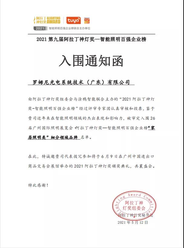 5月12日,阿拉丁神燈獎秘書處傳來喜訊,經過評審專家團認真審核和投票,ROMNEY被審定入圍 26 屆廣州國際照明展覽會·阿拉丁神燈獎——智能照明百強企業榜“家居照明類”細分領域品牌名單。并邀請ROMNEY參加將于 6 月 9 日在廣州中國進出口商品交易會展館舉辦的 2021 阿拉丁神燈獎頒獎典禮。