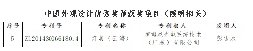 5月10日,中國專利獎評審辦公室在國家知識產權局網站對第二十二屆中國專利獎評審結果進行公示,ROMNEY公司的”云海“系列燈具有幸榮登預獲獎名單榜的優秀獎。