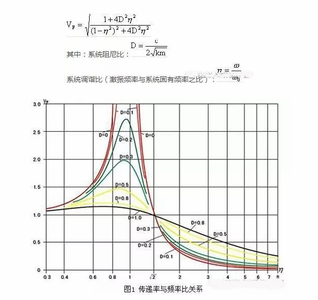 由圖1可見,當調(diào)諧比(即激振頻率與系統(tǒng)固有頻率之比)大于時,傳遞率小于1,這時,隨著激振頻率的增加,傳遞率減小。當調(diào)諧比小于時,傳遞比總是大于1,因此調(diào)諧比大于時,為隔振區(qū),調(diào)諧比小于時,為放大區(qū)。因此,由于機器激振頻率不可改變,要實現(xiàn)振動隔離,只有改變系統(tǒng)的固有頻率,使其滿足調(diào)諧比大于,這樣才能達到減小傳遞率的目的。工程實踐中,一般把調(diào)諧比取在2.5~5范圍內(nèi)。