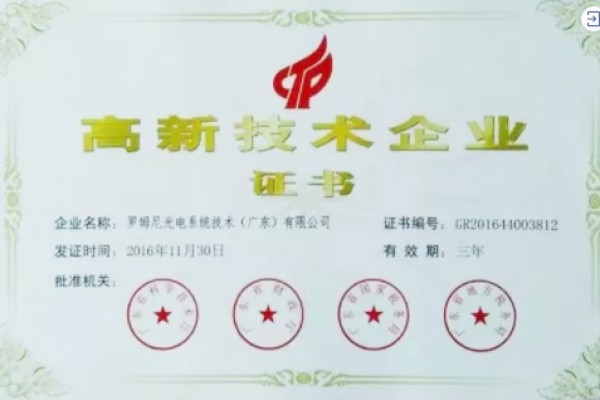 祝賀ROMNEY光電再次成為中國“國家高新技術企業”!